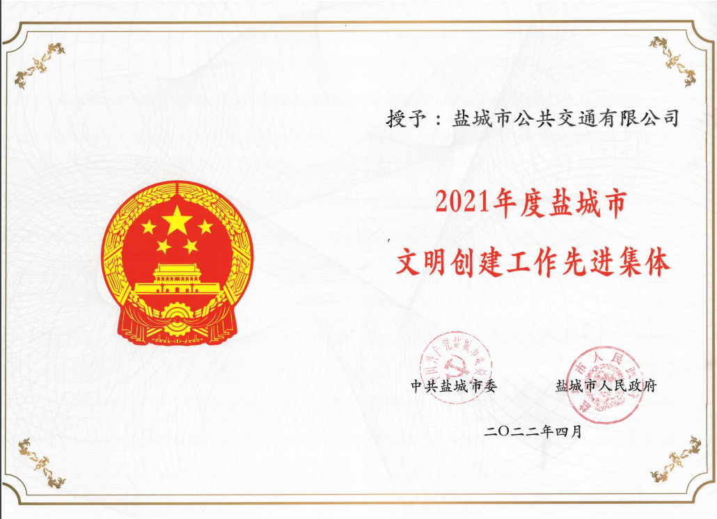 - 2022年4月公司被授予2021年度鹽城市文明創(chuàng)建工作先進(jìn)集體榮譽(yù)稱號(hào)